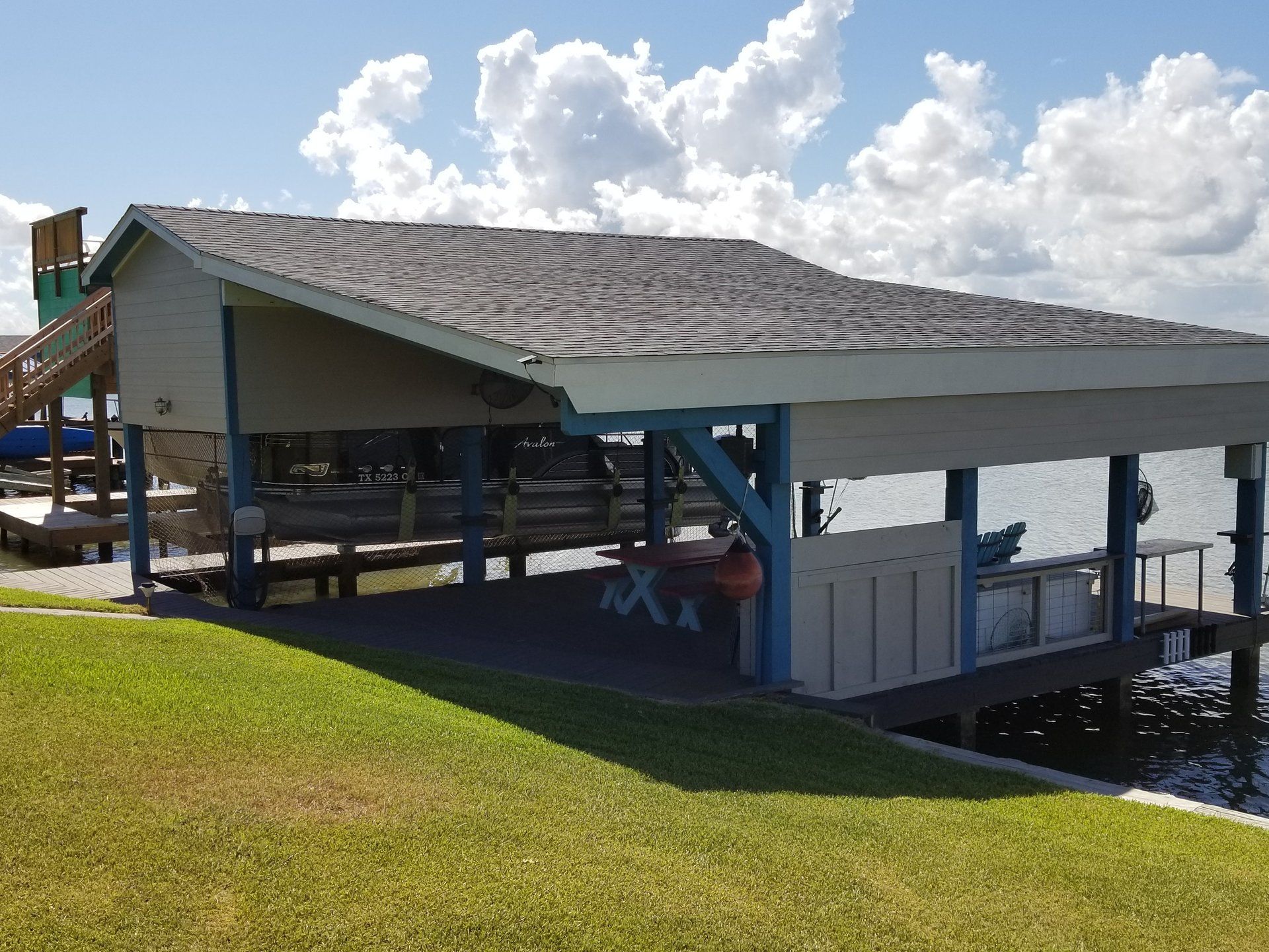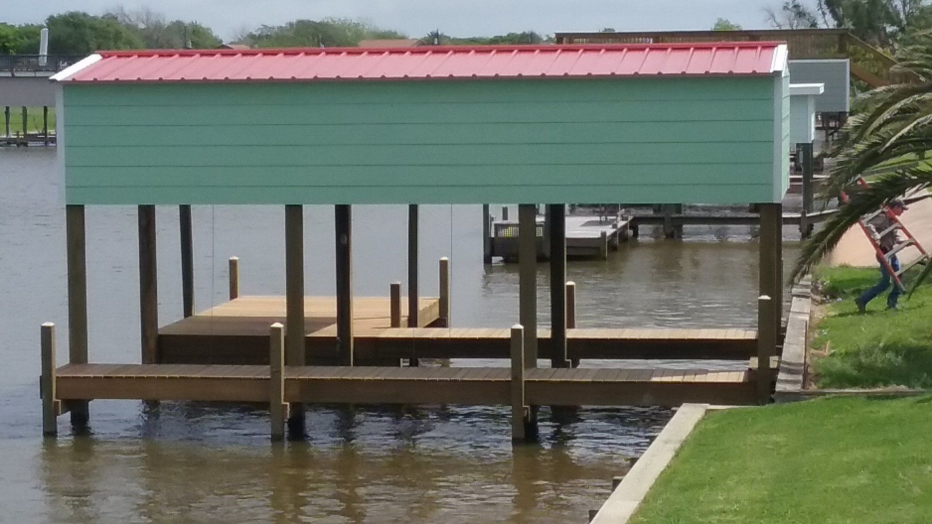 Our boathouses can be lifted from the water to prevent algae buildup and protect the boat from the harsh environment. Call us to build you a boat garage.